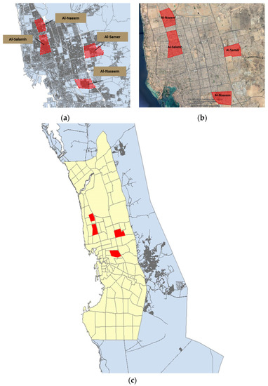 Map of Jeddah and the locations of the case studies. (a) GIS map of the case studies (b) Satellite map of the case studies (c) Jeddah’s districts.