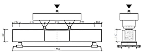 To analyze the load-bearing capacity of a longitudinal joint subjected to simple flexural stress, destructive laboratory testing was performed on sample joints designed with three basic types of splices in a central beam: by gluing, by gluing in combination with mechanical fasteners, and using only mechanical fasteners. Two material variants of splices were selected: from mature and laminated veneer lumber. In total, six test sets were created for two material variants of splices in combination with three methods of their fastening. Each test set consisted of five samples. For the testing, samples were assembled consisting of a central beam with dimensions 110 × 180 × 1220 mm and made of solid timber with the use of laminate veneer lumber splices and splices made of solid timber (see Figure 1).