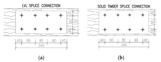 Countersunk self-tapping screws were used as the mechanical fasteners: Ø8/80 for joints with splices with laminated veneer lumber and Ø8/100 for joints with splices made of solid timber. Screws were made of carbon steel with white galvanic zinc coating and had a yield strength fyk = 1000 N mm−2. For the joining of each splice, eight screws were used (see Figure 2).