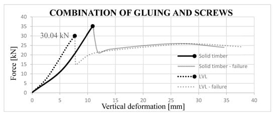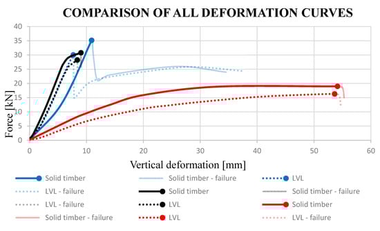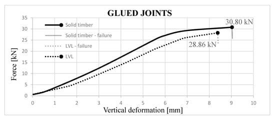 Vertical deformation increased even after reaching the maximal joint force. The mean value of the maximal vertical deformation was 37.78 mm for LVL splices, and with solid timber splices it was 34.56 mm (Figure 11).
