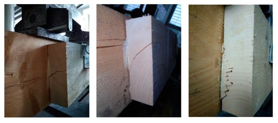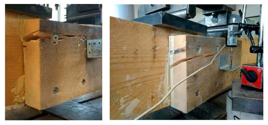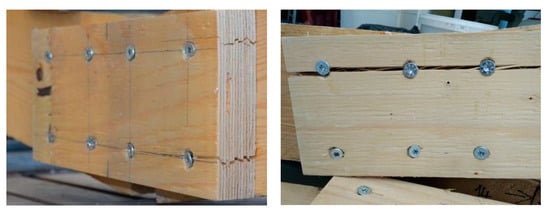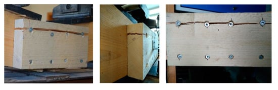 This type of joint with solid timber splices primarily suffered splitting in the upper pressed part of the splice in the plane of screws, while it simultaneously developed a crack from the middle element (beam) parallel or perpendicular to the annual rings, which was the same as for solid timber splices (Figure 13).