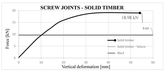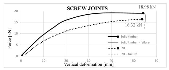 Deformation curves of screwed joints were partially linear, and then the joint had a ductile behavior. Ductility is typical for mechanical fasteners, especially for small-diameter fasteners that can bend. When the maximum load-carrying capacity of this joint was reached, there was a sudden failure of the joint; however, due to the mechanical fasteners (i.e., screws), total failure was postponed.
