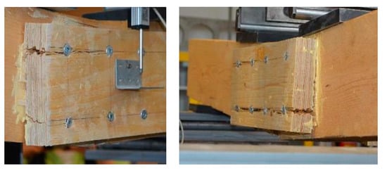 Figure 11 shows that the deformation curves of this type of joint were partially linear. When the maximum load-bearing capacity of this joint was reached, there was a sudden failure of the joint by brittle fracture, but total failure was delayed as a result of using mechanical fasteners (i.e., screws). The joint displayed ductile behavior, and its load-bearing capacity was limited by the mechanical joint. After the mechanical joint’s maximum load-carrying capacity was reached, the splice was split by tensile force perpendicular to the fibers (brittle behavior of timber).