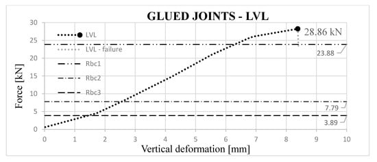 Figure 14 shows a comparison of the load-carrying capacity of glued joints with LVL splices determined using laboratory tests and calculations according to European standards. Results are displayed as deformation curves, with a maximum joint force of 28.26 kN. The load-carrying capacity of this joint type, determined using calculations according to valid standards, had three values for LVL splices: the load-carrying capacity of splices in shear was Rbc1 = 23.88 kN, of the glue-line with uniform distribution of shear was Rbc2 = 7.79 kN, and of the glue-line with unequal distribution of shear was Rbc3 = 3.89 kN.