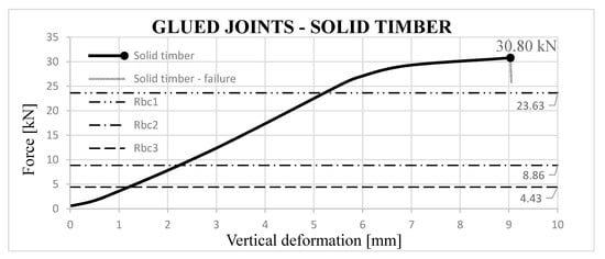 Figure 15 compares the load-carrying capacity of glued joints with solid timber splices determined using laboratory tests and calculations according to European standards. Results are displayed as deformation curves, with a maximum joint force of 30.80 kN. The load-carrying capacity of this joint type, determined using calculations according to valid standards, had three values for solid timber splices: the load-carrying capacity of splices in shear was Rbc1 = 23.63 kN, of the glue-line with uniform distribution of shear was Rbc2 = 8.86 kN, and of the glue-line with unequal distribution of shear was Rbc3 = 4.43 kN.