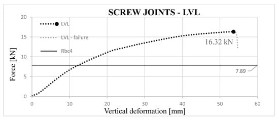Figure 16 compares the load-carrying capacity of screwed joints with LVL splices determined using laboratory tests and calculations according to European standards. Results are displayed as deformation curves, with maximum joint force of 16.32 kN. The load-carrying capacity of this joint type was Rbc4 = 7.89 kN, calculated according to valid standards.