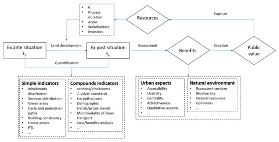 At the basis of the process assessment, there is the analysis of how different urban planning actions produce public value. Different operations can induce different effects on the land concerning the social, economic or environmental spheres of the city, but all these effects combine to create a better quality of life in an urban environment, and this can be translated into public value [16]. This parameter can be used as an indicator to compare the effects of different processes or to compare different development scenarios in analogy with the theories of value-led development planning approaches [17].