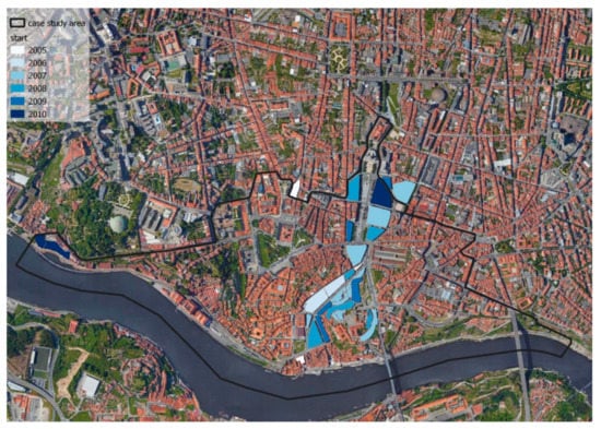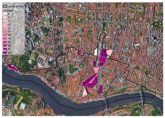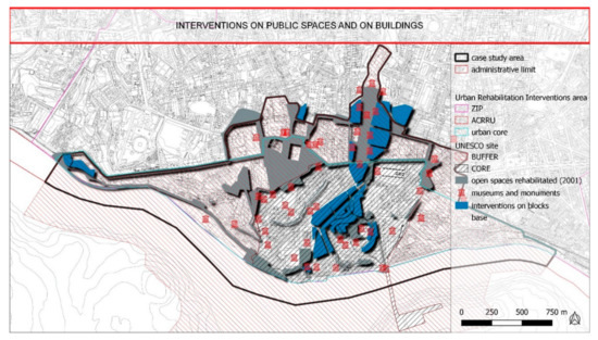 As stated in Section 2.2, intervention regarding open spaces and infrastructure is one tool in the hands of public bodies to boost private interventions. Enhancement of streets and squares allows the surrounding private buildings to acquire a higher value, and this can be a stimulus for stakeholders to operate to redevelop their properties. This theory was confirmed by practice as the following process started in 2005 with the aim of promoting architectural efficiency. Most of the buildings included in interventions are private, and the Municipality has the role of project manager [27]. Thanks to the creation of Porto Vivo, it was feasible to manage the relationships with private operators and to encourage them to employ private economic resources. This aspect allows the Municipality to invest little money within the process.