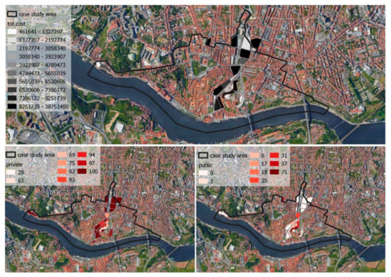 The various interventions started at different times and covered a period of about five years. In addition, the interventions analyzed were uneven also from the point of view of extension and cost. The use of the GIS software facilitated the creation of a database in which all the information reported in a disaggregated manner on the Porto Vivo website was systematized. This allowed us to determine, through mapping, how, where, and when public and private resources were invested.
