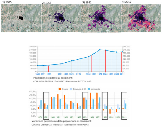 The third development phase was from the beginning of the new millennium until the 2008 economic crisis. In those years, there was a progressive conurbation of the various settlements gravitating towards Brescia, and the number of inhabitants slowly began to grow again (Figure 12).