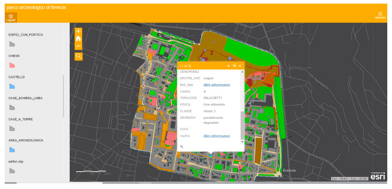 The strategy to enhance historical buildings is grounded on two different levels of analysis. The first level is more related to urban planning and refers to a lower scale level of detail, while the second level is more linked to conservative restauration and is carried out at a higher scale. The role of GIS is to link these two levels to create a database in which are mapped not only the features that are useful to build the strategy but also the minute interventions at the architectural scale. The use of a georeferenced database allows the addition of links to external documents that contain detailed pictures of damaged elements and sheets that explain how to operate (Figure 15).