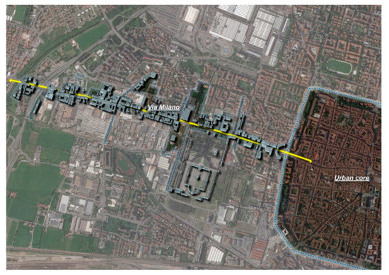 Exporting the urban core means that the strategy employed to enhance cultural heritage in the city center was used to study and define a strategy for minor historical sites as well. In particular, PGT 2016 identified the site around via Milano as strategic for the development of the city, [28,31]. This site is located on the western side of the urban core and creates the primary access to the city center for people coming from the western parts of the city and from the countryside (Figure 16).