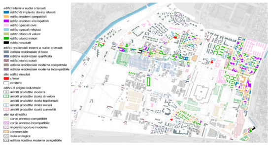 Thanks to the work and research of Giorgio Lombardi, it was possible to develop a methodology for the analysis of the historical areas of the city. That methodology aims to identify the main features of the historical fabric, from the morphological and typological point of view, and to outline a compatible line of intervention [5]. The filing techniques developed by Lombardi were mainly based on the analysis of the building components of the areas examined and had the strength of not being limited only to the analysis of the main monuments or buildings of greater historical–architectural value but included the whole urban area, in accordance with the main urban planning theories that were consolidating in the second half of the Twentieth century and that theorized the existence of a bijective relationship between the monuments and the environment in which they were inserted [6].
