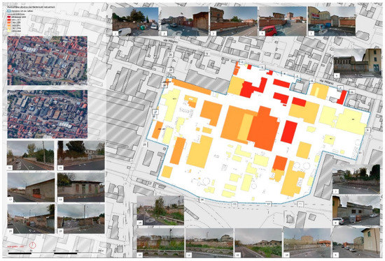For the via Milano case study, one of the goals of the municipality was to promote and to boost local shops and services system through the enhancement of historical assets (Figure 17 and Figure 18), such as the elements of industrial archaeology, which are now unused. To reach this objective, we analyzed different elements, such as the features of the built environment. This step is linked to the scheme developed by Giorgio Lombardi [5] and allowed us to identify the sites that can host new strategic functions or economic activities, people, and services distribution on the whole site and the infrastructure system with special attention to the clean mobility network.