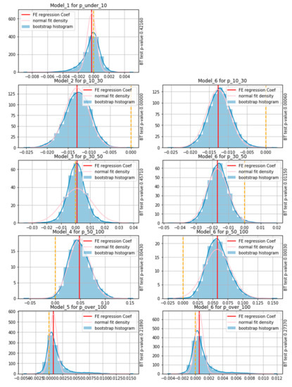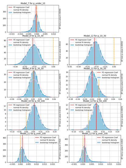 The results from the bootstrap analysis presented in Figure 2 confirm that these coefficients in Models 7–12 discussed above were robust. Furthermore, the t-test from the bootstrap analysis indicated the coefficients of p_30–50 and p_50–100 in Model 12 could be statistically significant at p < 10 and p < 5, respectively.