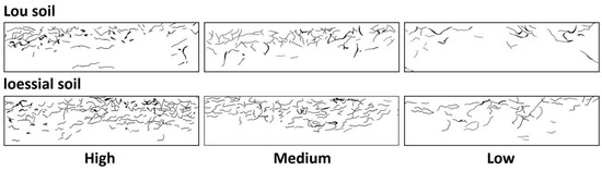 Scannogram of the earthworm burrow systems along the soil column wall (0–15 cm of soil layer) in two soil types for the three soil moisture treatments (High, Medium, and Low).