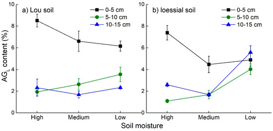 AGL formation following earthworm activity significantly varied across soil moisture and depth (p < 0.05, Table 2). AGL content ranged from 1.1% to 8.5% in High, 1.7% to 6.6% in Medium, and 2.3% to 6.2% in Low treatments and was significantly higher at the 0–5 cm soil depth than the other two soil depths (p < 0.05, Figure 2). At 0–5 cm soil depth, maximum AGL content was found in the High treatment, along with the greatest earthworm burrowing activity in terms of burrow area. However, AGL content in the High treatment dramatically decreased by 77.2–85.3% and 64.9–72.7% in Lou and loessial soil, respectively, at 5–10 cm and 10–15 cm, respectively, and AGL content in the Low treatments were highest. Small soil aggregates (AGS) were independent of soil moisture and depth (p > 0.05), indicating that earthworm activities mainly affected soil AGL formation.
