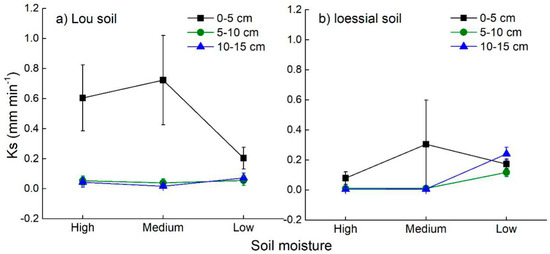 Soil hydraulic conductivity (Ks) under earthworm activities was independent of soil moisture content and soil type (p > 0.05, Table 2). The average Ks were 0.13 mm min−1, 0.18 mm min−1, and 0.14 mm min−1 in High, Medium, Low treatments, respectively. Ks in Lou soil ranged from 0.017 mm min−1 to 0.723 mm min−1 in all three moisture treatments for the total 0–15 cm soil depth, which was generally higher than in loessial soil, ranging from 0.004 mm min−1 to 0.304 mm min−1 (Figure 3). Ks showed significant differences between soil depths; Ks was highest at 0–5 cm soil depth, decreasing by 79% on average at 5–10 cm and showing little change at 10–15 cm. At 0–5 cm, Ks was highest in the Medium treatment in Lou and loessial soil, respectively (Figure 3). Ks in High and Medium treatments greatly decreased at deeper soil depths, and the highest Ks occurred in Low treatments at depths of 5–10 and 10–15 cm. Although Ks was independent of soil type (Table 2), Ks at 0–5 cm soil depth in Lou soil was up to 7.6 times higher than in loessial soil.