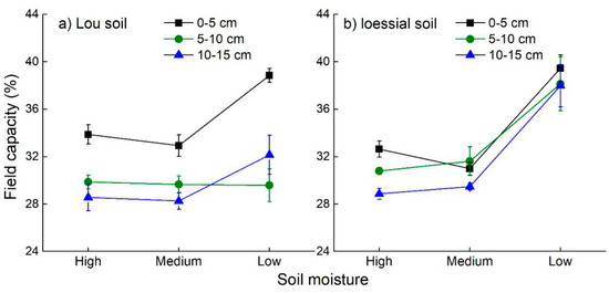 Field capacity showed significant differences across soil moisture treatments and highest values in Low treatments (p < 0.05, Figure 4). The field capacity in Low treatments on average was 36.0%, approximately 1.2 times higher than in High and Medium treatments. Field capacity was 31.5% and 33.3% in Lou and loessial soil, respectively, showing little difference between soil types (p > 0.05). However, field capacity was significantly different between soil depths (p <0.05), decreasing with increasing depth except in the Low treatment in Lou soil (higher at 10–15 cm than at 5–10 cm).