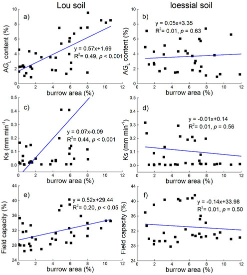 AGL content, Ks, and field capacity were significantly positively correlated with earthworm activity in terms of burrow area in Lou soil (p < 0.05, Figure 5a,c,e). As for loessial soil, burrow area showed no significant correlation with AGL content, Ks, and field capacity (Figure 5b,d,f).