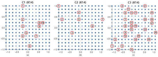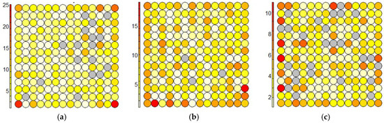 For each cluster, the results of the SOM were derived for comparison with the GTM. Figure 6 shows a blank node based on the SOM map of Clusters 1–3. The nodes displayed in gray on the SOM map are blank nodes. SOM map derived 17 blank nodes for Cluster 1, 3 for Cluster 2, and 27 for Cluster 3.