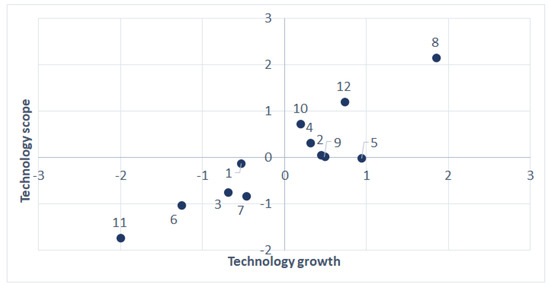 The quantity of patent can be calculated as Equation (3) using the concept of revealed technological advantage (RTA). The quantity is the ratio of the frequency of patents containing keywords derived from vacant technology in patent by cluster, which means the level of growth of the vacant technology in the cluster. The quantitative level of the vacant technology is determined by the gap between the vacant technology and the other vacant technology. It is calculated by substracting the RTA average of the other vacant technologies from the RTA value of the target vacant technologies. It is calculated by substracting the RTA average of vacant technologies. Subsequently, the quality of the patent uses the scope of technology (SoT) index Equation (4), which measures the average number of patent claims containing keywords derived from the cluster-specific patent gap. Consequently, the qualitative level of each vacant technology is calculated by substracting the average of the SoT values of other vacant technologies from the SoT value of the target vacant technology. As a result, the technical level of the derived vacant technologies was defined as shown in Figure 3.