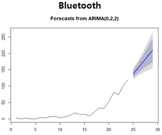 As a result of deriving blank nodes through the GTM algorithm and deriving vacant technology for each cluster, twelve vacant technologies were derived for Cluster 1, three for Cluster 2, and twelve for Cluster 3. To investigate the technology level of vacant technology, a technology growth—technology scope graph based on the number of patent applications and patent claims of the keyword was created. For the technologies that were found to be promising through the graph, six vacant technologies in Cluster 1 were found to have a high prospectiveness, and one in Cluster 2 and seven in Cluster 3 respectively. When applying the time series analysis through the ARIMA model to confirm whether the technologies are promising in the future, the terms sensor and vehicle are the technologies that are both vacant technologies and promising in Cluster 1. Respectively, for those of Cluster 2 it is Bluetooth, and for Cluster 3 they are beacon and data.