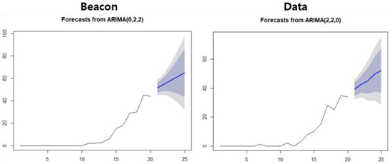 Promisingness of technology has properties such as radical novelty, relatively fast growth, coherence, noticeable impact, and uncertainty [37]. In particular, the growth rate of technology can be confirmed through the trend of increasing the frequency of patent filings by year, conducting autoregressive integrated moving average (ARIMA) analysis by time series data of patent filing frequency by year, and promisingness of technology through trends derived from the analysis results. The ARIMA model is combined (Equation (7)) of the auto-regression (AR) model (Equation (5)) and the moving average (MA) model (Equation (6)). AR model (Equation (5)) is a model that constructs autocorrelation as a time series model using past values, and the MA model (Equation (6)) is a model that predicts a specific point in the future based on past time series data. Using the ARIMA model (Equation (7)) is suitable for predicting the future using past data [52]. The future trend of the keyword can be predicted through ARIMA analysis, and based on this, keywords that are likely to become mainstream in the future market can be identified [53].