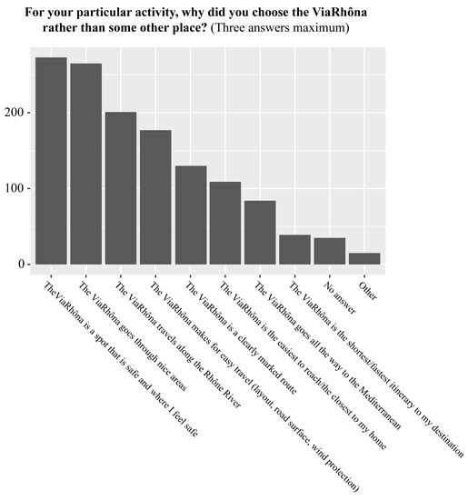 - The first part looked at the activities of the person (type of travel, sectors visited, frequency of activity, and years of practice). Some questions aimed to characterise the motivations of people to use the ViaRhôna using a psychometric scale inspired by the work of Smith and Moore [22], who used this scale to characterise demand for recreational activities and sites.