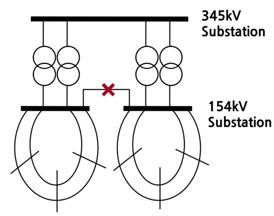 Attention should be paid to whether the transformer is overloaded when disconnecting it in this manner. As the transformers are split for each bus, the total amount of power that each can withstand must be sufficient to cover even a single transformer failure. This is specified in the Korean power grid reliability standards, which states that there must be no problems in operation with an N-1 failure. To satisfy this condition, the transformer must have spare capacity relative to the existing power consumption. If there is spare capacity, then the two transformers can be split while also independently configuring the 154 kV voltage level, resulting in a much greater reduction in short circuit current. However, if there is no spare capacity, transformer failure may result in a violation of the reliability standards. Therefore, the rear end must be connected with a 154 kV level transmission line to eliminate any potential problems. This is illustrated in Figure 3 and Figure 4.