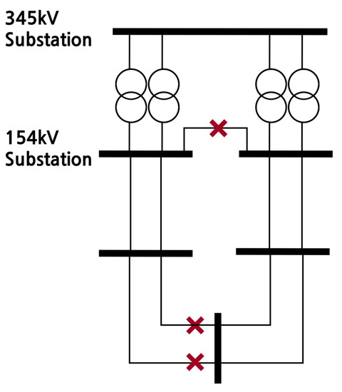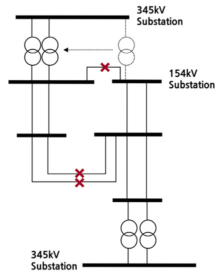 In Figure 2, the transformer does not have spare capacity. Hence, configuring the 154 kV substation independently would violate the reliability standards if a single transformer failed. The lower end should, therefore, be linked to maintain grid stability. When implementing bus separation as above, and as additional line separation is not conducted, separating the transformer can considerably reduce the short circuit current, even though the reduction amount is limited. Accordingly, this is utilised for the bus separation action.