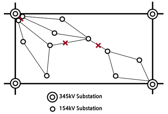 The 8th power grid supply and demand plan was used for grid analysis to minimise the sites exceeding the fault capacity, and the power grid data from 2018 to 2025 were used to verify the effectiveness of the proposed method. In the grid data, minimal bus separation and line separation should be performed in advance for 345 kV buses to ensure that there is no excessive short circuit current for these buses. For the 154 kV buses, both bus separation and line separation were removed, and an integrated grid was created. Additionally, for short circuit current analysis, all generators in the power grid were turned on, and sub-transient impedance was used for generator impedance to generate the maximum short circuit current.