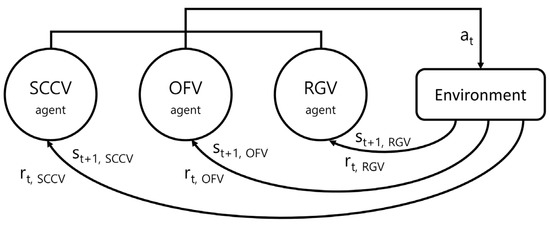 As there are three types of agents in this study, the state and reward according to the action are also divided into three types. Every action causes a change in the environment and a different effect on each agent. Therefore, one action is executed, and each pair of agent state and reward is given accordingly. This concept is shown in Figure 10.