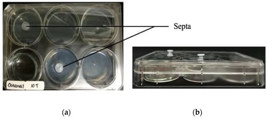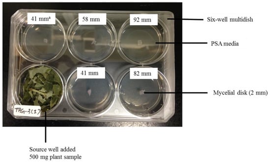 The bioassay used to screen the antifungal activity of plant volatiles was performed by using a modified dish pack method [24]. Briefly, six-well multi dishes (Nunc, external dimensions: 128 × 86 mm, 35 mm-diameter wells) were prepared according to the protocol proposed in [10]. A five-day-old colony of FOL (race 1 and race 2) and 500 mg of each plant sample were used (Figure 1). The radial diameter of the fungal colony in each well was measured on the third day after incubation in an incubator (NTS Model MI-25S) at 25 °C. Mycelial growth inhibition was calculated according to Equation (1) [25] based on the average result from two wells at a distance of 41 mm (as two replications) from the source well with the dried sample: