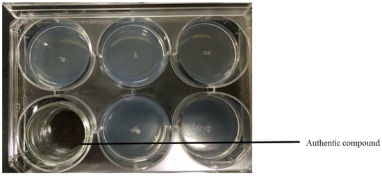 All authentic compounds were diluted with dimethyl sulfoxide (DMSO) to obtain six dilution ratios (1.0, 1.3, 1.7, 2.5, 5.0 and 10%, v/v). The antifungal bioassay was carried out following the same procedure as described in Section 2.3; however, 50 µL of diluted authentic volatile compounds was added into the source well instead of plant samples (Figure 2). The bioassay was replicated three times for each compound. Mycelial growth inhibition was measured and calculated as previously described.