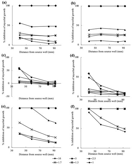 Mycelial growth inhibition of Fusarium oxysporum f. sp. lycopersici (FOL) race 1 (a,c,e) and FOL race 2 (b,d,f) as a function of distance from the source well with octanal (a,b), octanol (c,d) and trans-2-hexenal (e,f). Different lines represent the concentrations (%, v/v) of the compound added to the source wells. Each value represents the mean of three replicates.
