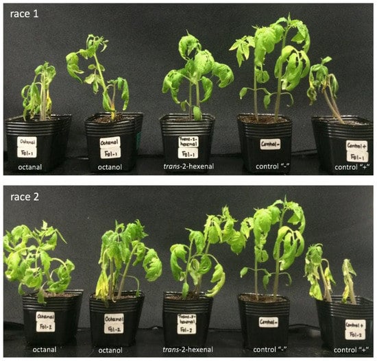 In conclusion, among 109 plant species, fruit volatiles of H. sosnowskyi demonstrated the strongest antifungal activity against FOL race 1. Authentic volatile octanol demonstrated the lowest EC50 value against both FOL races, significantly inhibited the disease incidence of tomato plants and suppressed the growth of conidial density, similar to trans-2-hexenal and the negative control. In this regards, octanol and trans-2-hexenal may be considered to be prospective natural fungicides against F. oxysporum f. sp. lycopersici. It is still unclear if the tested compounds themselves can replace methyl bromide or other fumigants and fungicides; however, these compounds might be implemented into components of a new management strategy. However, further study is needed on the practical application and safety evaluation of these volatile compounds as novel biofumigants against F. oxysporum f. sp. lycopersici.