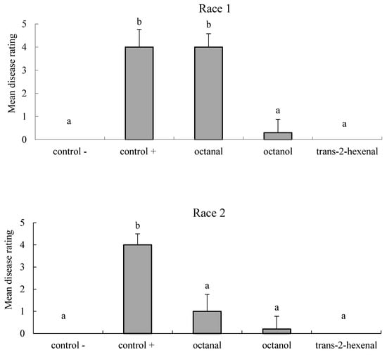 Disease severity of FOL race 1 and race 2 on tomato plants in octanal, octanol and trans-2-hexenal-treated soil. The same letters indicate that the values are not significantly different (p < 0.05) according to the Student’s t-test. ND, No data.