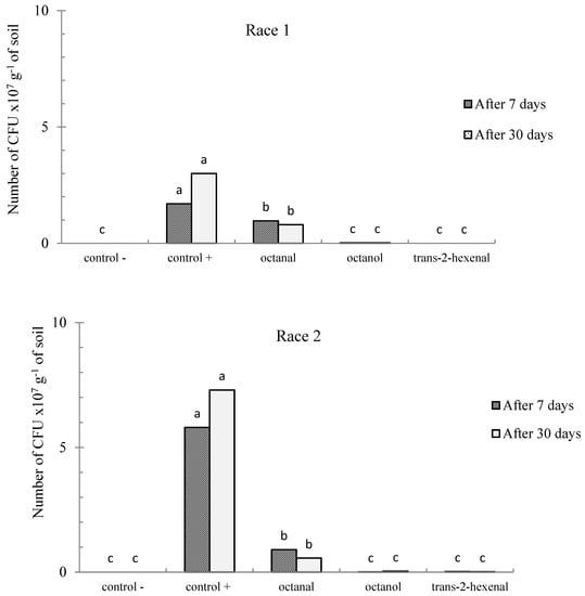 In the soil conidial population assay (Figure 8), colonies of FOL race 1 in trans-2-hexenal-treated soil were absent, which was similar to the negative control, and visual disease symptoms were absent. In octanol-treated soil, a low number of conidial populations was detected 7 and 30 days after fumigation, while the highest amount of conidial populations was found in octanal-treated soil, which was comparable to the positive control.