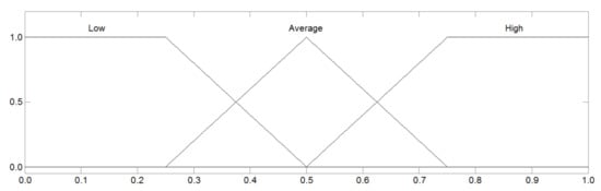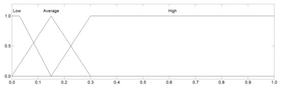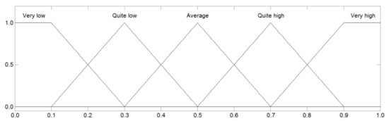 The output variable (y) was described in space Y. The range of Y spaces was set in percentage [0; 100%] but in decimal notation [0.0; 1.0], namely in the same was as for all X spaces of input variables. The set of linguistic terms in space Y includes five fuzzy sets corresponding to the resulting conclusions in the rule base: “very low”, “quite low”, “average”, “quite high”, and “very high”.