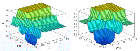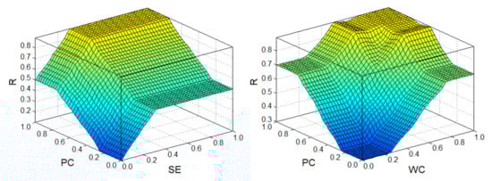 Figure 5 confirms the observations described above with regard to the application of the last of maxima defuzzyfication method. On the left, the resultant plane for the output variable (R) is shown due to the influence of PC and SE input variables for the cross-section in which WC input variable is 0.5. The resultant plane is analogous to the set of input variables WC and SE, but PC is 0.5. The same plane is shown on the right but taking into account the set of PC and WC input variables for the cross-section in which SE input variable is 0.5.