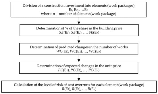 The calculations were made in accordance with the diagram shown in Figure 7. First, the division of a construction investment into elements (works packages) was made. Then, values were adopted for all input variables of the model: Share of element costs in the building costs (SE), predicted changes in the number of works (WC), and expected changes in the unit price (PC). In the last step, the risk of cost overruns was calculated.