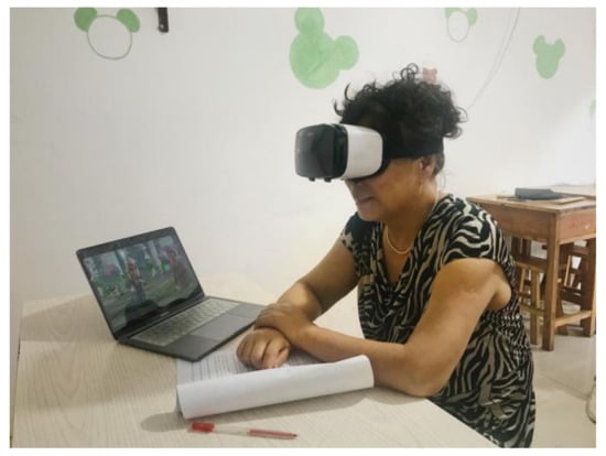 A questionnaire survey was performed on 114 elderly individuals aged 60–89. Prior to filling out the questionnaire, the researcher asked the participants to try on the Memo VR Headset as a virtual reality experience (Figure 1). The elderly’s understanding of social VR was improved by playing a Facebook Horizon [44] video. During the video, the researcher explained the video content and related services.