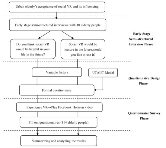 Through early stage semi-structured interviews, we assessed the factors related to social VR video content and old age, the elderly’s acceptance of science and technology, and summarized the factors influencing the acceptance of technology. This analysis stage was divided into two stages (Figure 2).