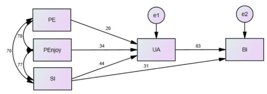 According to regression analysis, PE was verified in the preliminary theoretical hypothesis to positively affect UA (H1). PEnjoy positively affected UA (H3), SI positively affected UA (H5), SI positively affected BI (H6), and UA positively affected BI (H7). The revised model removed EE and FC dimensions, which did not significantly influence UA. The revised model is shown in Figure 3.
