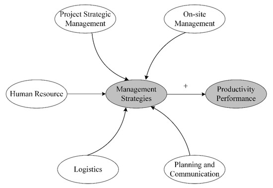 To identify the most critical management strategies that can help improve productivity, this study proposed a theoretical model that hypothesizes management strategies could result in growth of productivity performance. Figure 1 presents the model, where management strategies cover five aspects identified from the literature review, namely, project strategic management, on-site management, planning and communication, logistics, and human resources. Productivity performance covers productivity indicators at the industry, company, project, and trade levels.