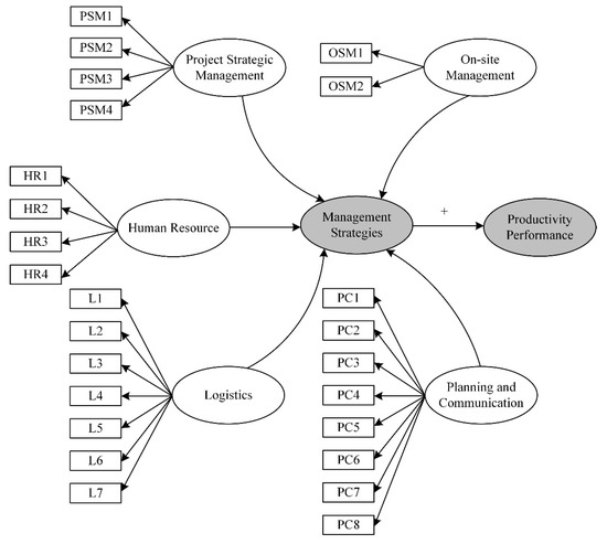Structural equation modeling (SEM) is regarded as one of the most suitable methods for analyzing the causal relationships between multiple variables. Different from the first-generation regression models (e.g., stepwise multiple regression model), which can analyze only one layer of linkage between variables at a time, SEM can analyze the relationships among multiple variables simultaneously [41]. Considering the various types of management strategies identified in this study, SEM was adopted to test the hypothesis of this research, namely the implementation of management strategies could lead to growth of productivity performance. Williams et al. [42] mentioned that SEM has two forms, namely, partial least squares structural equation modeling (PLS-SEM) and covariance-based structural equation modeling (CB-SEM). Compared with CB-SEM, PLS-SEM has two major advantages, namely, its suitability for dealing with data collected from a questionnaire using a small sample size and better interpretability when dealing with highly skewed data [43,44]. Therefore, this study employed PLS-SEM.