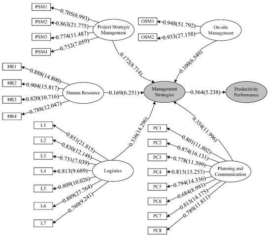 As for the structural model, the test results generated by the software SmartPLS show that the path coefficient between management strategies and productivity performance has a t-value of 5.238, which is higher than 2.58. The relationship between management strategies and productivity performance is therefore statistically significant at the 0.01 level. Such finding supports the hypothesis that management strategies can improve construction productivity. In addition, as shown in Table 8, “planning and communication” and “logistics” received higher path coefficients than the remaining three categories, suggesting they are more critical management strategies. Figure 3 shows the whole results of the proposed model tested by SmartPLS.