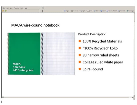 In order to set up both domains, respondents were asked to evaluate a prompt for a notebook manufactured by a hypothetical company, MACA. A standard notebook was presented and the participants were given a short product description including basic information (“80 narrow ruled sheets”, “College ruled white paper”, and “Spiral-bound”). The first survey represented an environmental CSR component by noting that the notebook was “100% Recycled”, which was also noted in the product description, as seen in Figure 2.