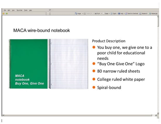 For the social domain, the environmental domain survey was modified to focus on a hypothetical donation campaign. This represents a cause-related marketing approach which has seen growing popularity among marketing managers to promote the socially responsible image of the firm and has also been of focus within the marketing literature [70]. Instead of noting that the product was “100% Recycled”, the key social responsibility aspect was changed to the notebook being advertised as “Buy one, Give one” and provided further information such as “You buy one, we give one to a poor child for educational needs,” as seen in Figure 3.